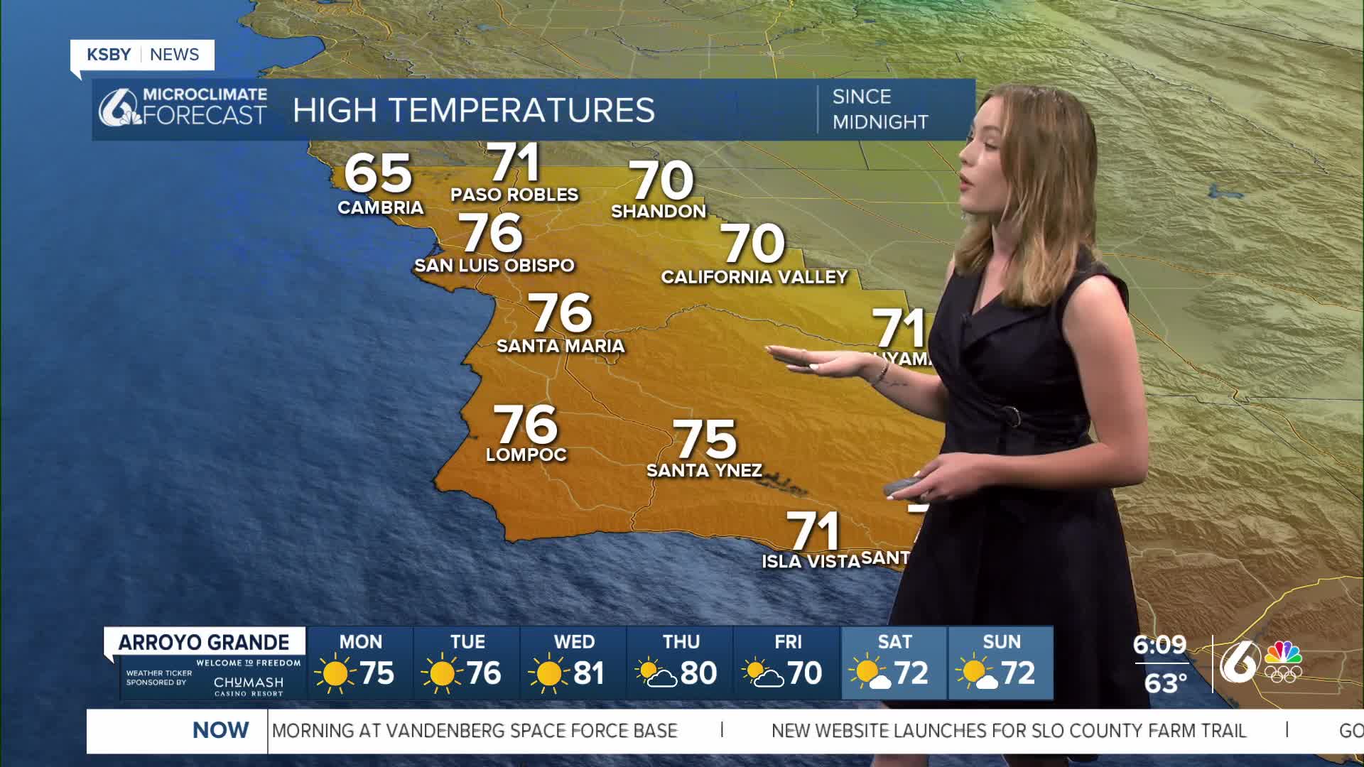 We've got warm temperatures ahead with a bump into the 80s by the middle of the week. Before we get there, we are starting the week with mostly mid 70s across the region. The southern beaches will have slightly more cloud coverage today than San Luis Obispo county, but temperatures will stay consistent.