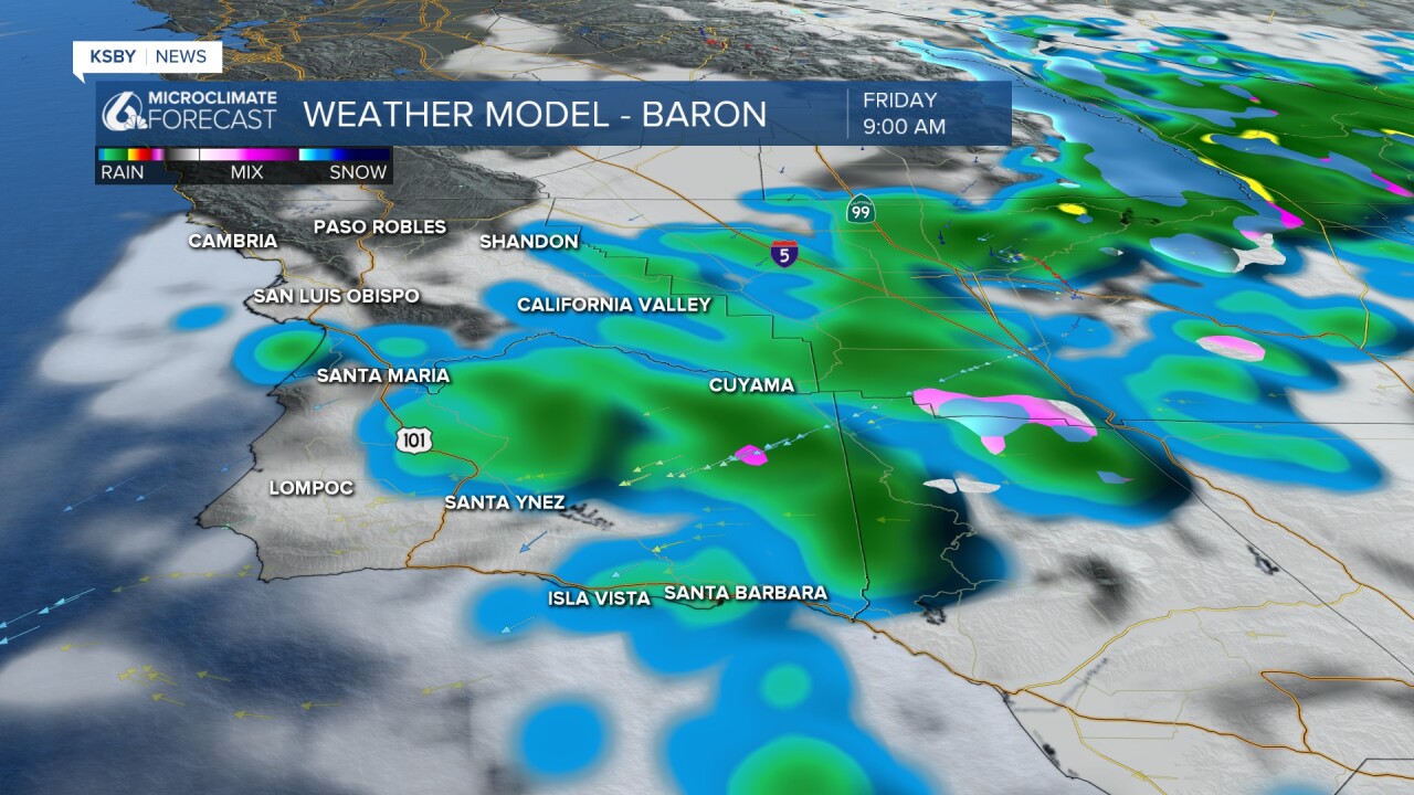 Most of this rain will clear out after Saturday morning for the South Coast. Here's another look at one of our models.