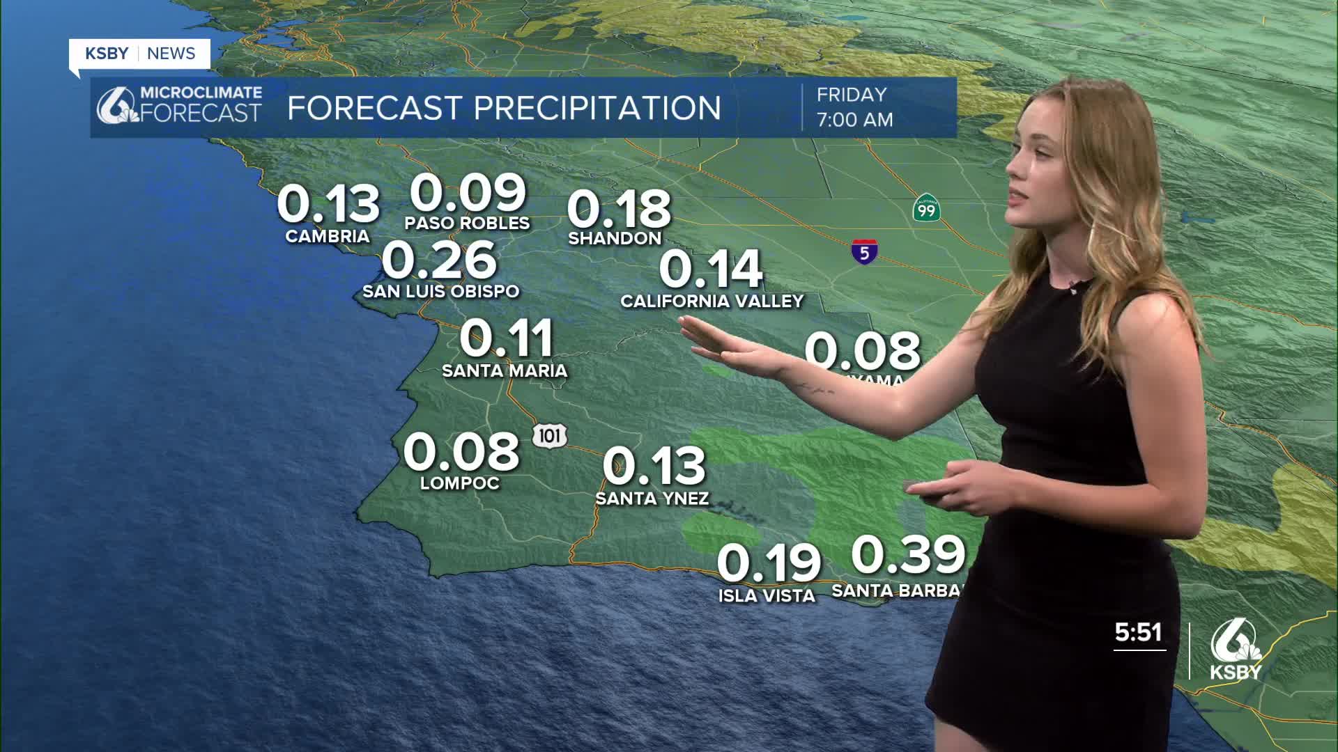 For the closer future, there's a prediction of about two to four inches of total rain across the region. Santa Barbara and San Luis Obispo will be hit the hardest with about four inches. Most of the rain that will contribute to these totals will hit on Saturday, where heavier rains are expected.